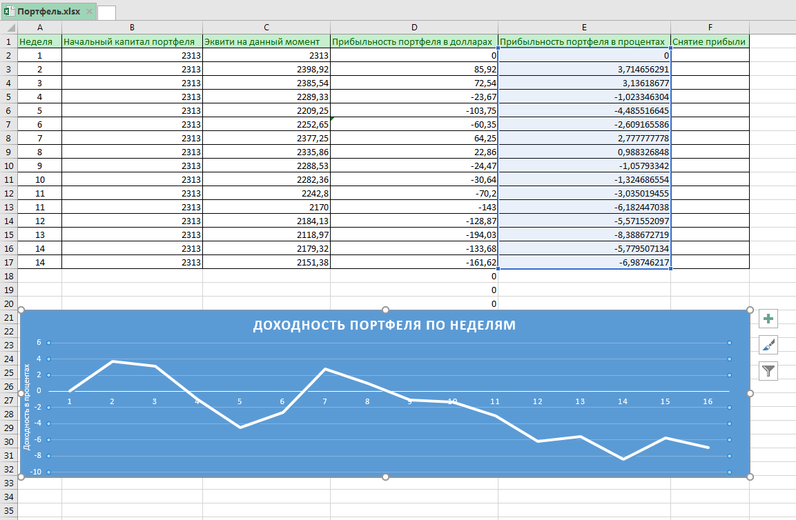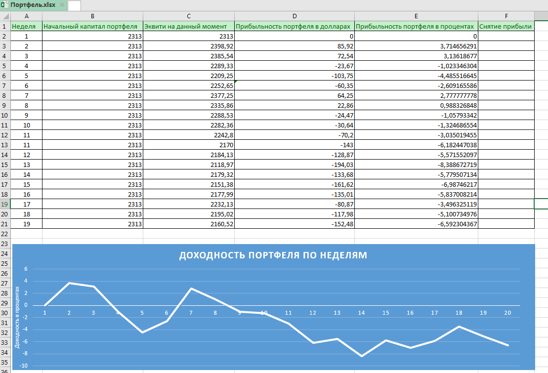 Итак, можем посмотреть результаты по портфелю, что у нас вышло за неделю. Как видим, просадка значительно уменьшилась, хотя пока имеет место быть. Связано с тем, что Фрейм, в общем то управляющий, из за которого просадка и появилась, начал выходить из нее. В общем были еще сделки у Профит лайна и Селдика с Неро, но они мало повлияли на общие показатели.