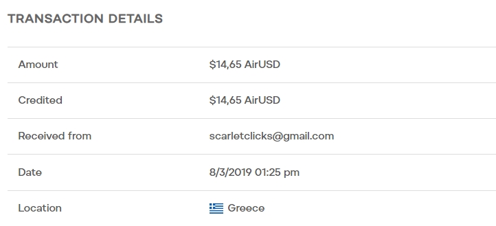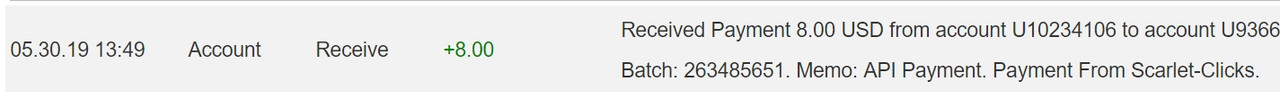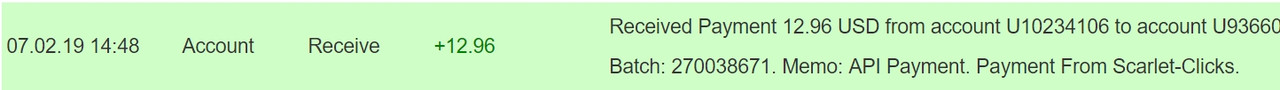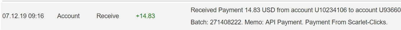The amount of 15.61 USD has been deposited to your account. Accounts: U10234106->U2054***. Memo: API Payment. Payment From Scarlet-Clicks.. Date: 14:47 02.07.19. Batch: 270038610.