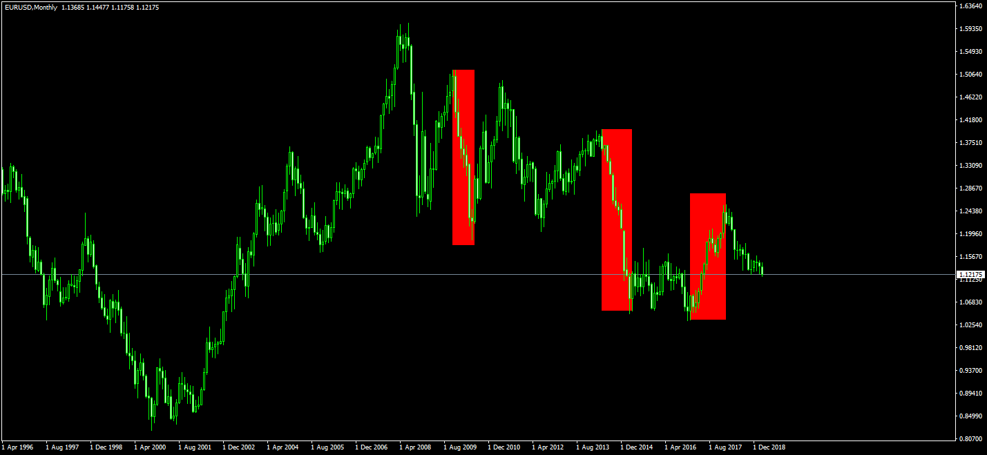 В итоге мы имеем то, что имеем, долгосрочные тренды на рынке форекс большая редкость. Хотя, тренды, которые длятся год и даже больше, случаются. Так что, если тренд длинною в год на рынке форекс бывает, значит держать сделку по несколько месяцев есть смысл? Это уже спорный вопрос, давайте для начала взглянем на график того же евро доллара. Тут на рисунке я выделил места, за последние десять лет, где был смысл держать открытой сделку от трех месяцев и более. То есть такие, однозначные тренды, которые четко дали бы хороший профит по таким долгоиграющим сделкам.