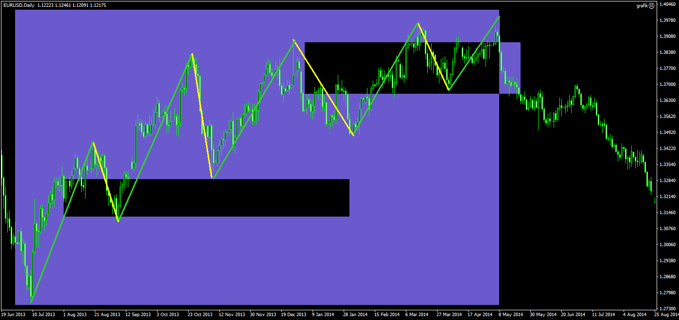 А теперь обратите внимание на движения в сторону тренда, которые я обозначил зелеными отрезками. Каждое из этих движений продолжалось около месяца, в среднем и проходило расстояние порядка 500-700 пунктов. Это значит, что вполне реально было взять порядка 200-300(опять зависит от скорости реакции торговой системы) пунктов несколькими сделками, в течении этого тренда, держа сделку от недели и до нескольких недель.