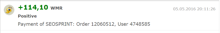 04.05.16 16:48 Receive Received Payment 1.00 USD from account U2391050 to account U220****. Batch: 131715813. Memo: API Payment. Payment of SEOSPRINT: Order 12048253