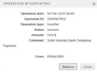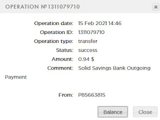 0.39 USD: The amount of 0.39 USD has been deposited to your account. Accounts: U22766463->U19811025. Memo: API Payment. Solid Savings Bank Outgoing Transfer.. Date: 19:06 13.02.21. Batch: 368742710.