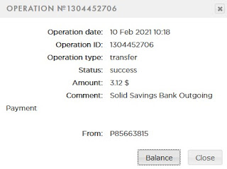 3.30 USD: The amount of 3.3 USD has been deposited to your account. Accounts: U22766463->U19811025. Memo: API Payment. Solid Savings Bank Outgoing Transfer.. Date: 06:27 10.02.21. Batch: 367873696.