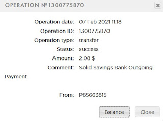 3.30 USD: The amount of 3.3 USD has been deposited to your account. Accounts: U22766463->U19811025. Memo: API Payment. Solid Savings Bank Outgoing Transfer.. Date: 06:54 05.02.21. Batch: 366727223.