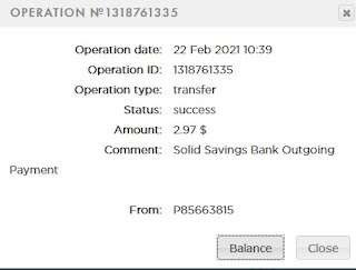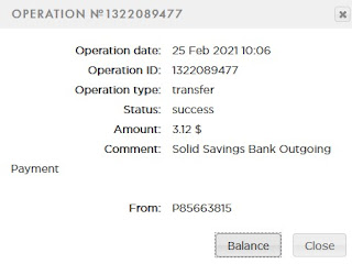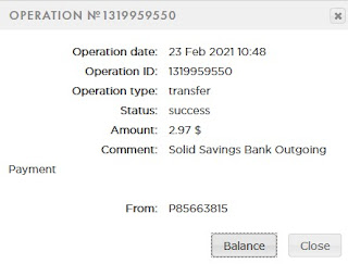 3.33 USD: The amount of 3.33 USD has been deposited to your account. Accounts: U22766463->U19811025. Memo: API Payment. Solid Savings Bank Outgoing Transfer.. Date: 17:52 02.03.21. Batch: 373631140.