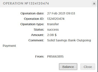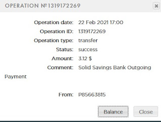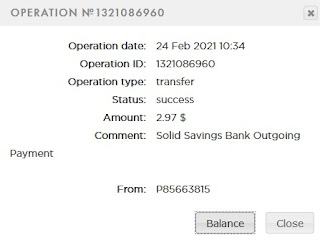 3.30 USD: The amount of 3.3 USD has been deposited to your account. Accounts: U22766463->U19811025. Memo: API Payment. Solid Savings Bank Outgoing Transfer.. Date: 06:15 25.02.21. Batch: 371553699. 3.32 USD: The amount of 3.32 USD has been deposited to your account. Accounts: U22766463->U19811025. Memo: API Payment. Solid Savings Bank Outgoing Transfer.. Date: 06:15 25.02.21. Batch: 371553772.