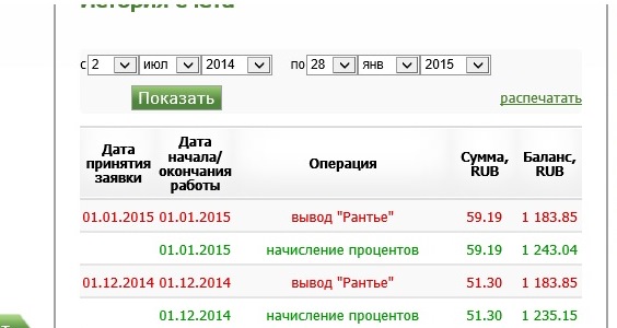 Выплаты проходят в порядке очереди. В этом месяце - в 2 этапа: 1) Вам будет выплачено 5% от Вашего депозита, инвестированного в рублях по курсу на день внесения средств; 2) Вам будет выплачена положительная курсовая разница по состоянию на 1 февраля 2015 года (другими словами -разница между курсом инвестирования и курсом доллара на 01.02.2015).