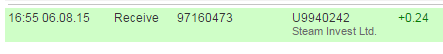 14:46 06.08.15 97140193 Received Payment 0.14 USD from account U9940242. Memo: Thank you for participating in our project. Steam Invest Ltd. wishes you always successful and profitable investment.*
