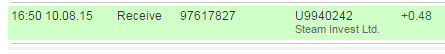 04:37 11.08.15 97662691 Received Payment 0.14 USD from account U9940242. Memo: Thank you for participating in our project. Steam Invest Ltd. wishes you always successful and profitable investment.