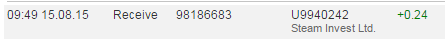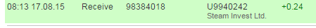 16.08.15 16:34 Receive Received Payment 0.36 USD from account U9940242. Batch: 98325081. Memo: Thank you for participating in our project. Steam Invest Ltd. wishes you always successful and profitable investment