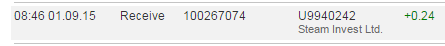 07:24 01.09.15 Receive 100160513 U9940242 +2.25 Received Payment 2.25 USD from account U9940242. Memo: Thank you for participating in our project. Steam Invest Ltd. wishes you always successful and profitable investment