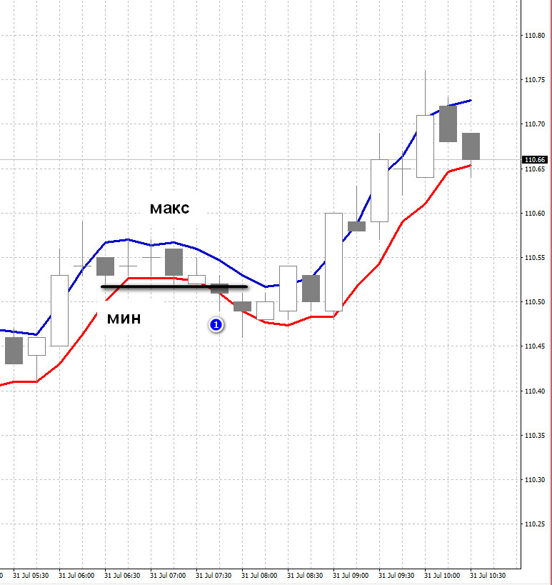 После того как был определен минимум и максимум, в точке 1 произошел прорыв минимумов, что опредилило направление тенденции, как падающий тренд. Значит пока не проьит максимум, будем работать от шорта, входя когда цена пересечет верхнюю скользящую