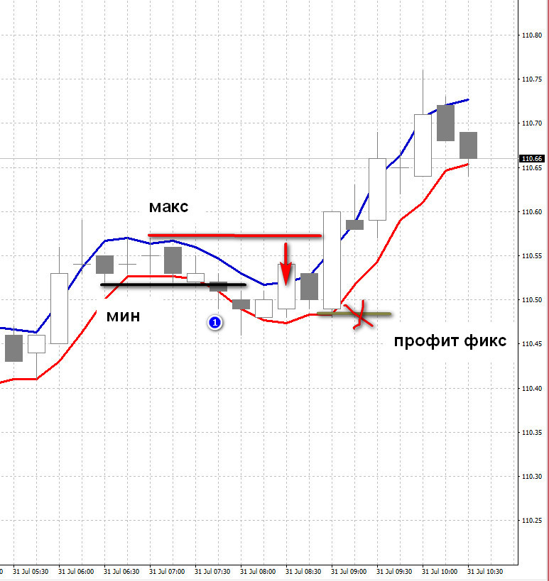 После входа в шорт (цена пересекла скользячку и закрылась ниже максимума), выставляем тейк профит на противоположной скользящей, постоянно переставляя его за ней. Стоп-лосс располагаем чуть выше максимума (на несколько пипсов). Сделка закрылась в плюс, по профиту