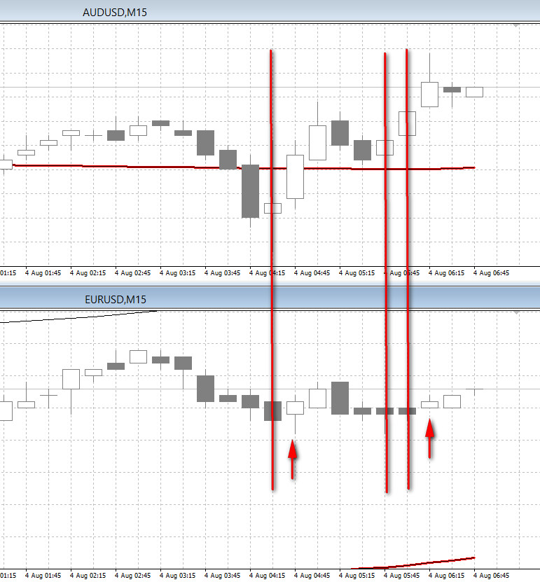 Берем две валютные пары - идеальная связка EUR/USD и AUD/USD, располагаем их графики по горизонтали друг за другом, синхронизируем свечи. Выбрать можно любой таймфрейм (об этом позже). Синхронизировав по времени изменения свечей - ищем расхождения: