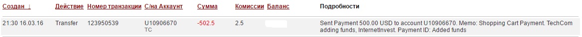 Примечание: TechCom adding funds, InternetInvest ref. # Added funds