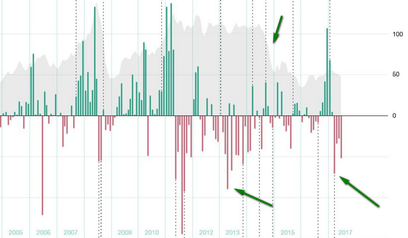 Московская биржа не сумела вырастить за годы существования отечественного инвестора. Поэтому, чтобы определить кризис заранее, следует изучать отчеты по оттоку капитала. Последние данные, как показано на картинке. говорят о грядущем кризисе. У трейдеров есть в запасе два три года, чтобы избежать обнуление портфеля: