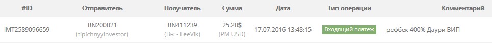 15.07.2016 16:30:19 Входящий платеж рефбек 200% (Проект - Dauri Finance)