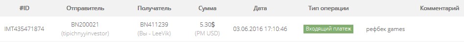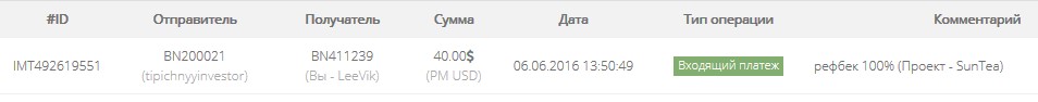 30.05.2016 17:48:19 Входящий платеж рефбек 100% (Проект - SunTea)