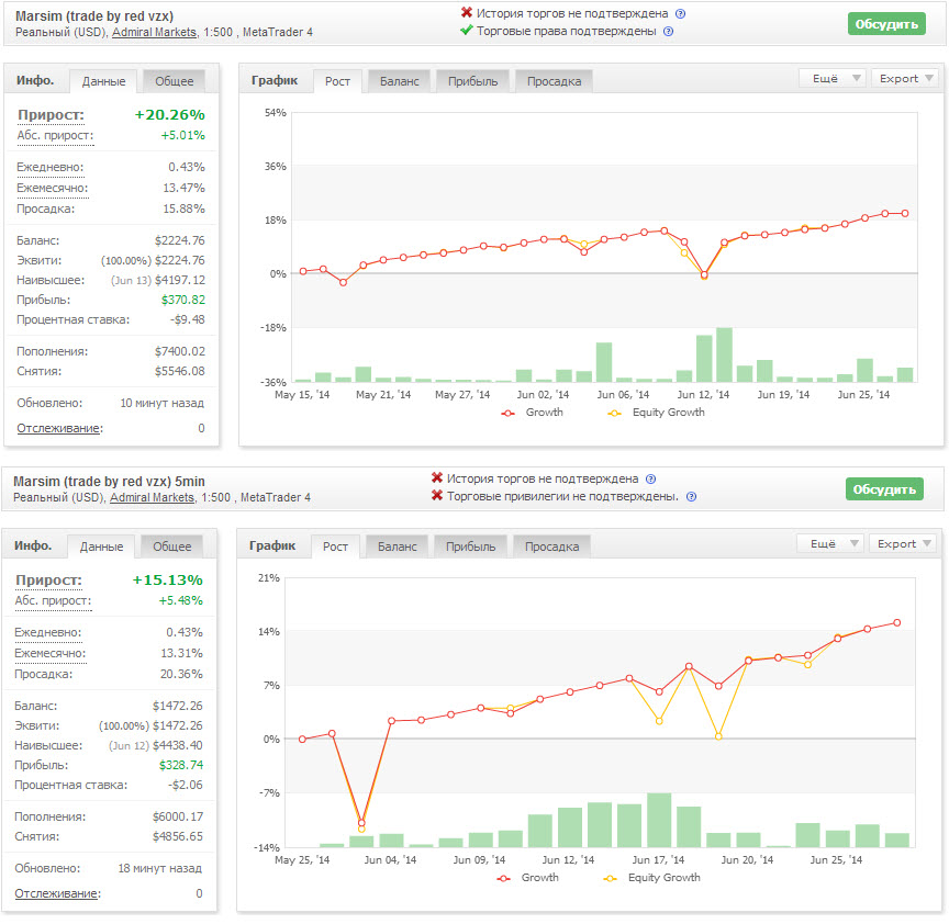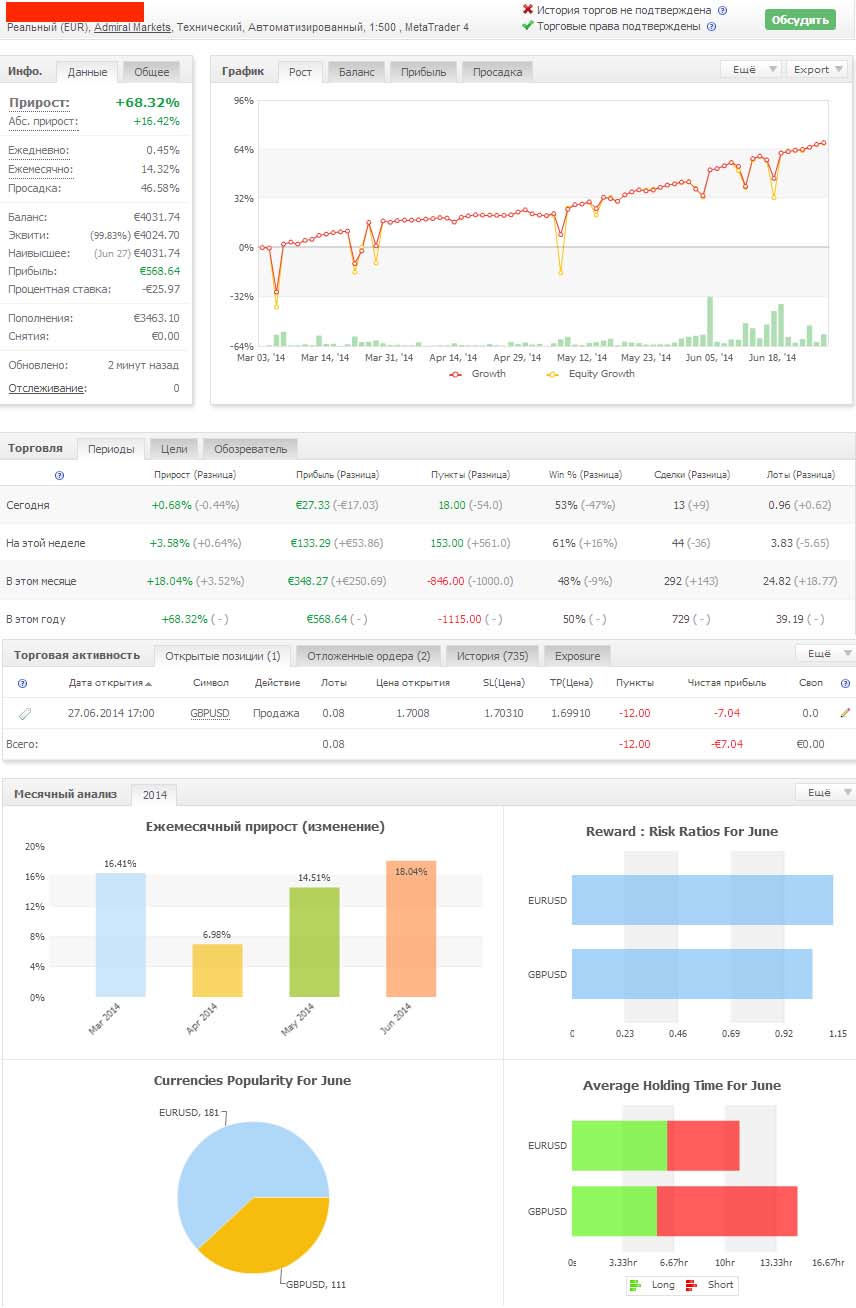 Прошу обратить внимание всех тех, кто интересуется работой Памма на то ,что информация по Памму ,которую Вы можете увидеть ,зайдя по ссылке в подписи,не является достоверной. Я об этом многократно говорил в теме ,что нельзя ориентироваться на цифры ,указываемые в мониторинге и еще раз убедился в этом сейчас , когда вижу информацию по счету.Ну никак не может быть прибыльность отрицательной когда при начальном балансе капитала управляющего в 10000 долларов и прибыли в 433 доллара должно быть +4.33% ,а не -13.53%.Это полный нонсенс.Памм будет давать среднюю прибыльность около 20% ежемесячно.Поэтому можете спокойно подключаться к счету с нового месяца.