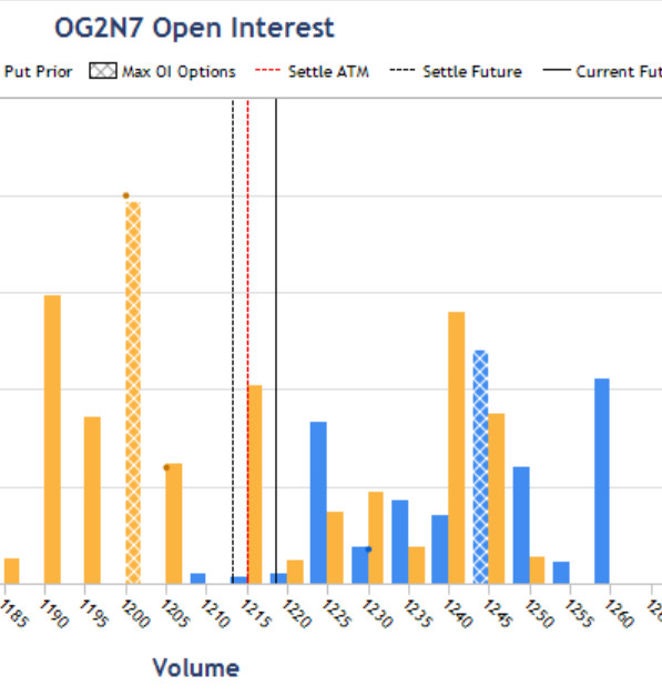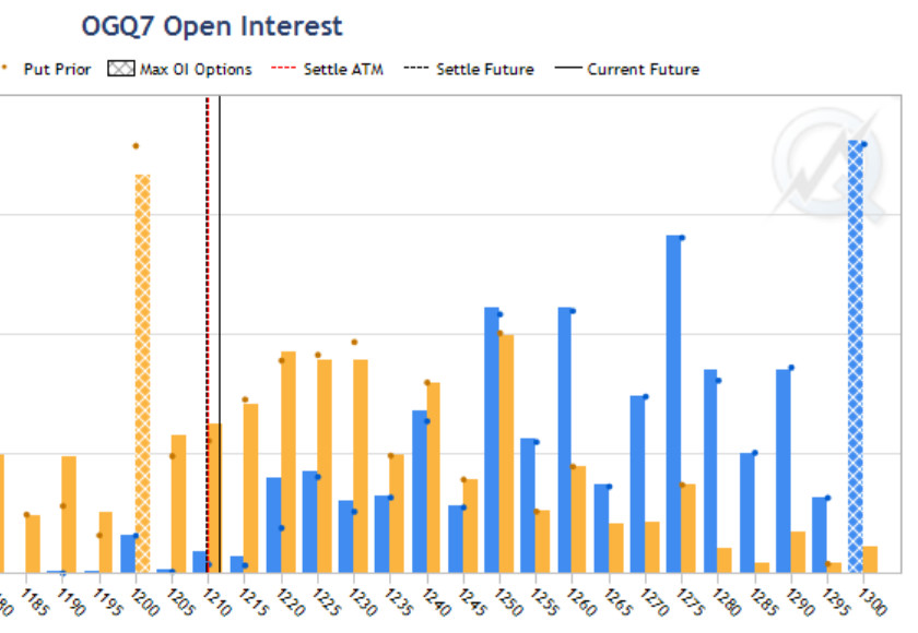 Вчера рассматривал недельные опционные уровни,сегодня можно посмотреть на опционы длиной в месяц. У них как и у недельных максимальный уровень PUT расположен на 1200 - разница только в премии на 50 пп, что для волатильности золота несущественно.