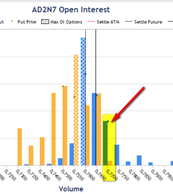 Распад опционной премии делает точку входа в шорт AUD/USD все ниже и ниже, "отметая" вверху зоны, которые цена могла бы достичь: