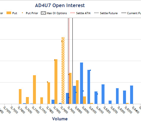 Вчера, рассматривая пару австралийца я показал, что по гистограмме открытого интереса опционов текущего месяца, виден флэт. Недельные опционы более категоричны, предполагая падение. Котировки стоят посредине, что не дает нам точку входа, но цена "зашла" за максимальный уровень PUT на гистограмме опционов месяца, поэтому ожидаю коррекцию.