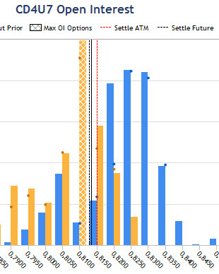 Если посмотреть на текущие котировки USD/CAD относительно расположения максимального открытого интереса опционов, мы заметим "вылет" за максимум Call. Это намекает на разворот, но опционная премия пока еще слишком высока и канадец вполне может укрепиться на 200 пп