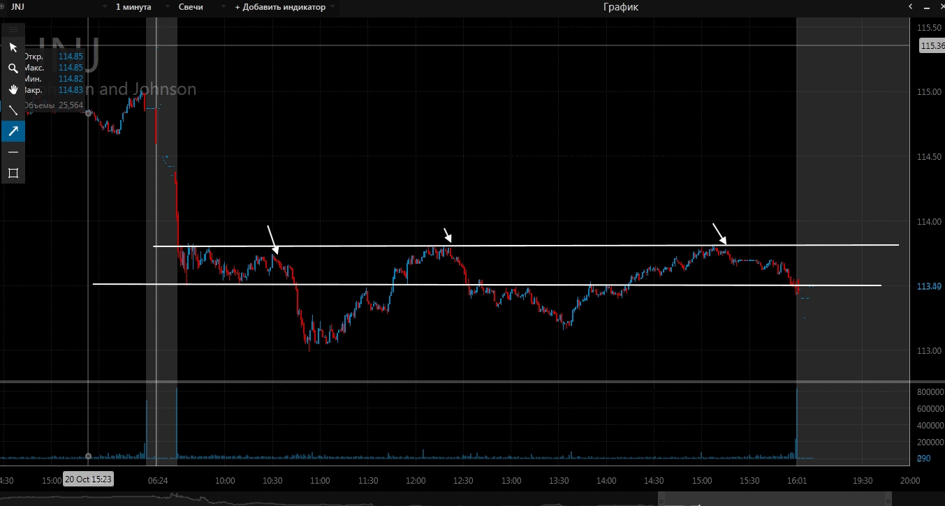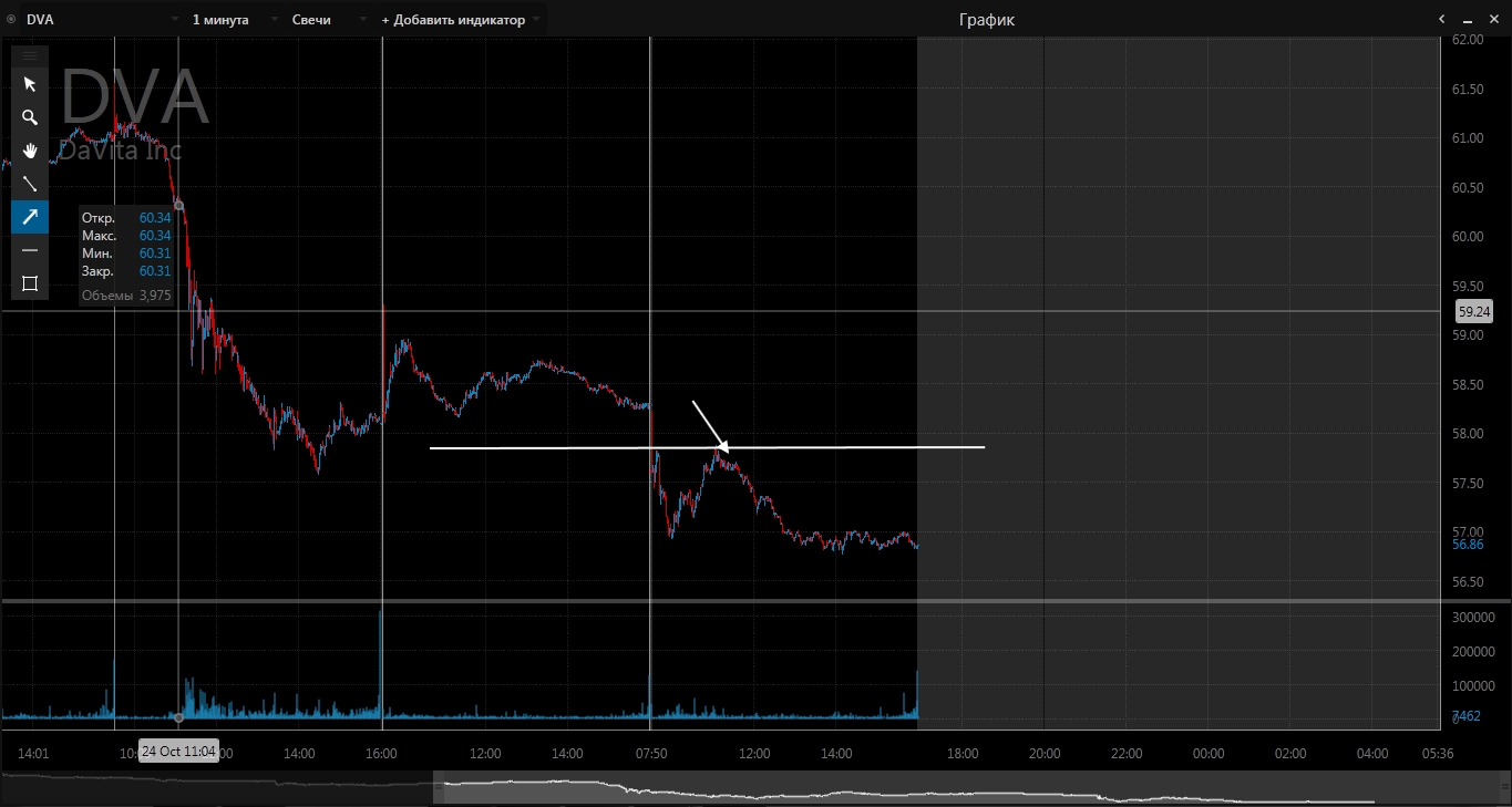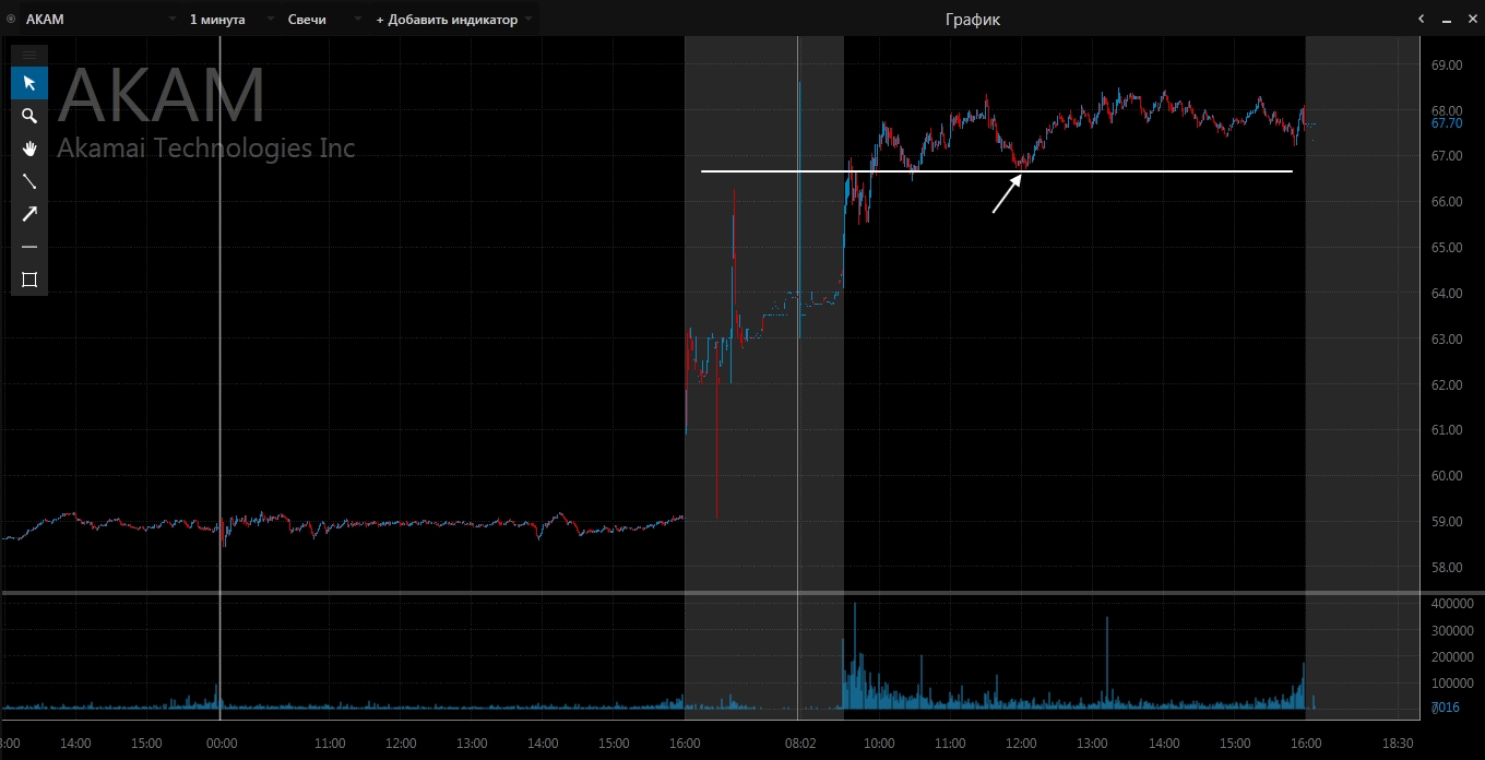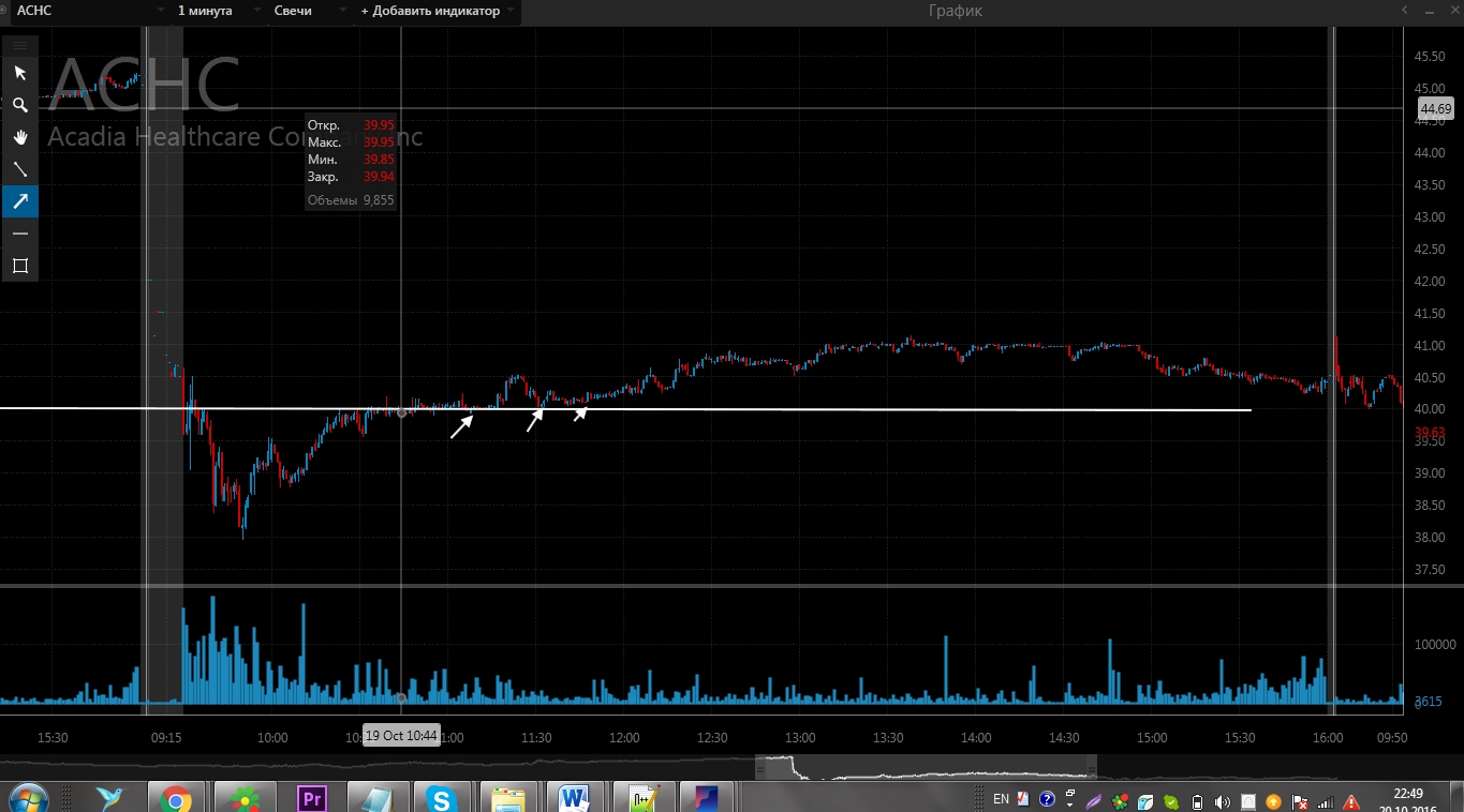 Отличный разворот с удержанием хорошего уровня 40. Акция после открытия быстро упала, после чего был импульс, небольшой откат и плавно движение и акция "легла" на уровень. Было видно, что ниже не пойдет, а после того, как цена не дошла до уровня, после импульса нужно покупать. Это показано на второй стрелочке.