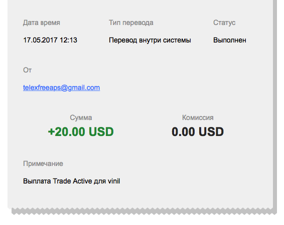 TRADE ACTIVE LTD +3.00 Received Payment 3.00 USD from account U7789077. Memo: API Payment. Выплата Trade Active для GodfatherBlog . Payment ID: 1494924536