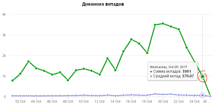группа форумчан хитранила тот почас крупными депами по выходным (до 500 доходило у некоторых), потом выходила... то ли админ там не просёк это, то ли надеялся дождаться очередных выходных, но не дождался, в середине недели был очень сильный отток (с понедельника)... к сожалению, влетели те, кто надеялся идти до конца, постепенно наращивая вклад, кто не выводил вклады... но вообще можно винить только себя - нужно было следить за статой (сам там немного играл, упустил момент выхода, хотя и посматривал на график депозитов, так что в итоге в нуле) по большому счёту там админ показал свою неопытность, несмотря на долгоживущие почасы с огромными кассами, в проектах заработали только хитраннеры... чисто имхо :k-unsure:
