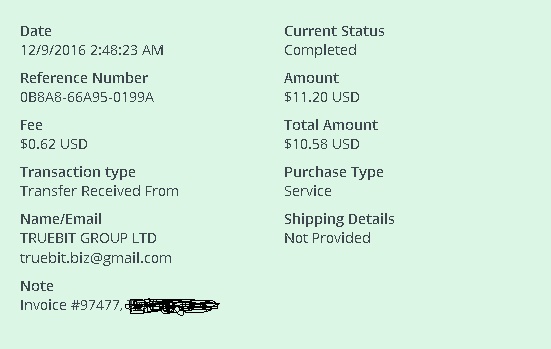 09.12.16 14:52 Receive Received Payment 0.36 USD from account U12965146 to account U8_. Batch: 156615249. Memo: API Payment. Invoice 98553, cosar.