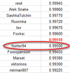 nikolja07 - 0.99620 (менее 50 пп до ставки Foxksi - 0.9960, сделанной ранее)