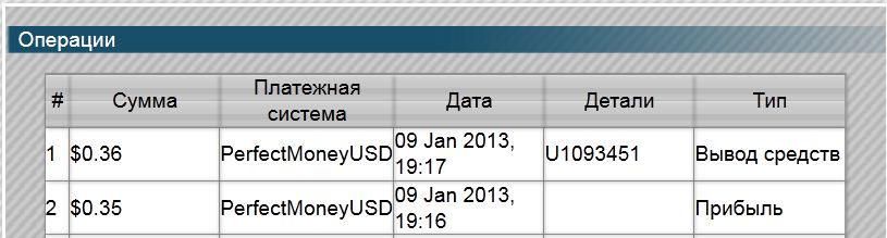 The amount of 0.36 USD has been deposited to your Perfect Money account. Memo: API Payment. Withdraw from UPS.. Date: 21:42 09.01.13. Batch: 15263807. :wink2:
