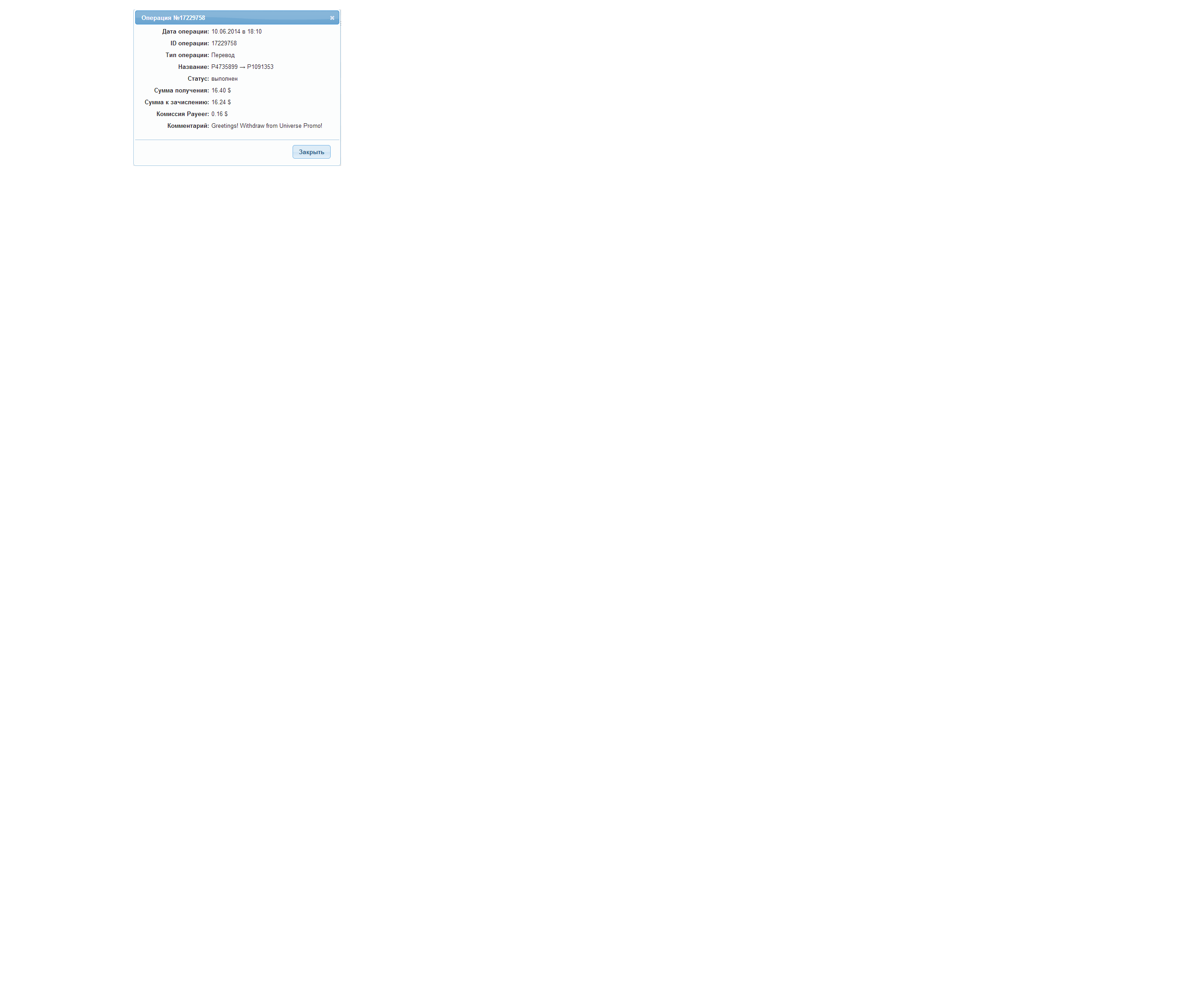 04.06.14 10:56 Receive Received Payment 13.15 USD from account U1601317 to account U220****. Batch: 59355170. Memo: Greetings! Withdraw from Universe Promo!