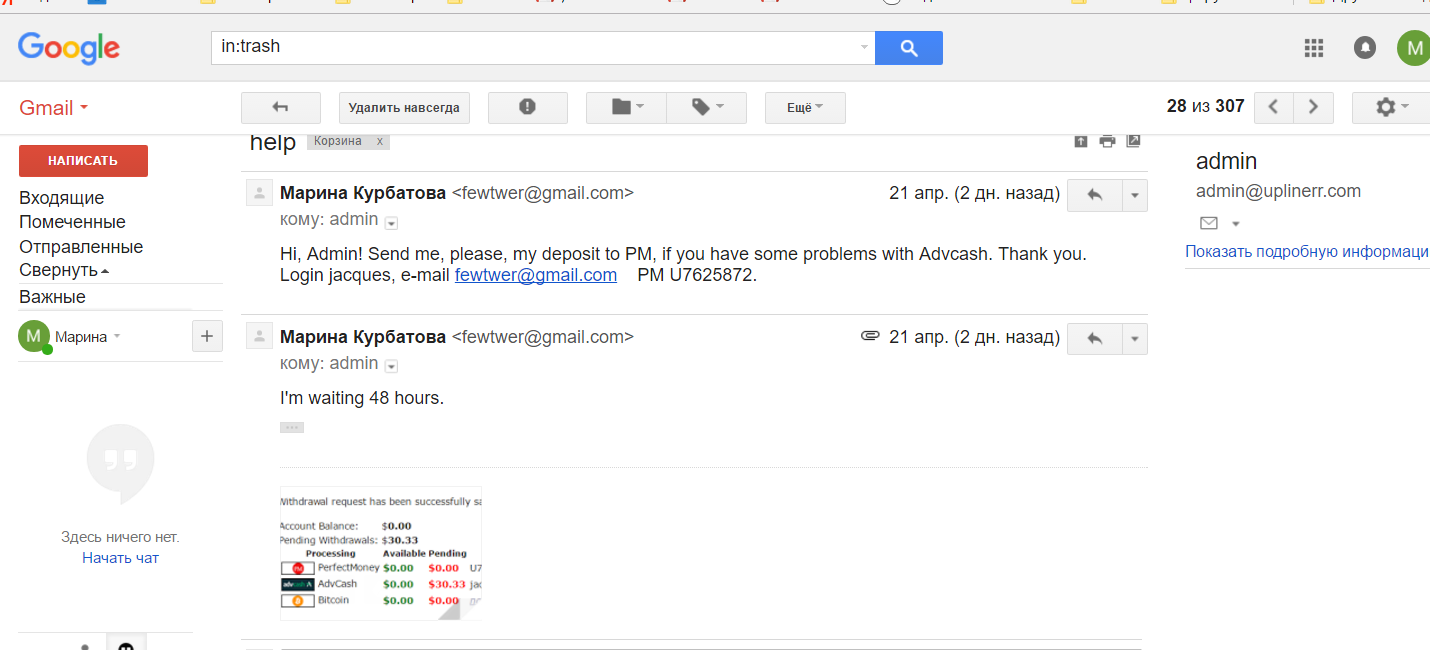 Письмо было отправлено админу 21/04. В нем написано, что с момента заказа выплаты прошло 48 часов.