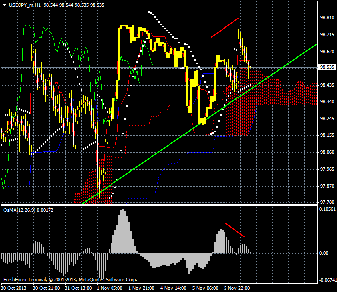 Йена показала хороший рост медвежьей активности по индикатору OsMA, то предполагает продолжение банкета по ее снижению. сейчас коррекция, но думаю, что она продолжится до завтрашнего дня, а сегодня уже курс падать не будет, а вот завтра уже можно оценивать возможности для продаж.