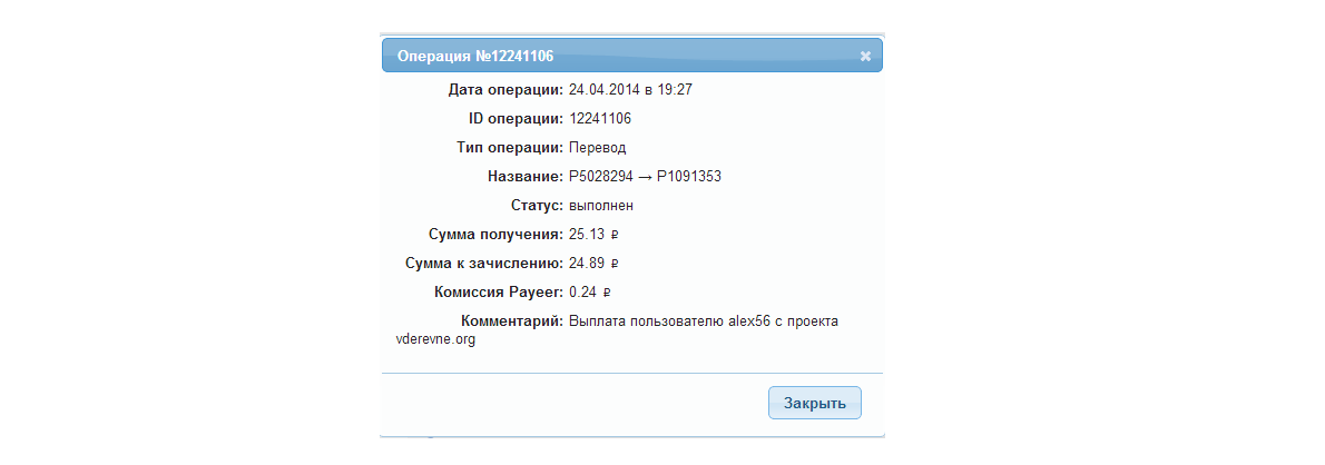 Комментарий: Выплата пользователю **** с проекта vderevne.org