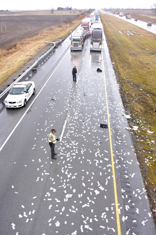 В американском штате Иллинойс автомобиль, перевозивший деньги для игровых автоматов, попал в аварию. По дороге рассыпались купюры номиналом пять, десять и двадцать долларов, из-за чего скоростную трассу пришлось перекрыть, сообщает UPI.