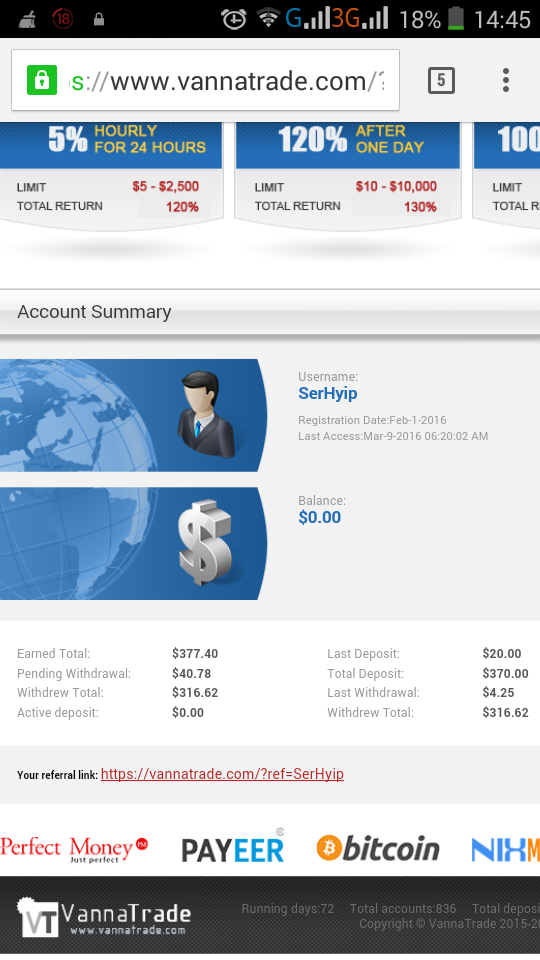 The amount of 0.4 USD has been deposited to your Perfect Money account. Accounts: U7153934->U1000597. Memo: API Payment. Withdraw to hyiphall from Vanna Trade Limited.. Date: 07:36 06.03.16. Batch: 122548027.