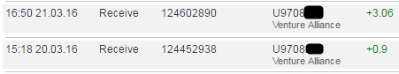 19:55 21.03.16 Receive 124630938 U9708261 Venture Alliance Received Payment 0.66 USD from account U9708261. Memo: API Payment. Auto.