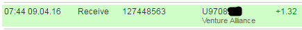 14:01 09.04.16 Receive 127498633 U9708261 Venture Alliance Received Payment 1.00 USD from account U9708261. Memo: API Payment. Auto.