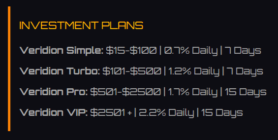 Veridion VIP от 2501$ 2.2% в сутки на 15 дней (итого 133%)