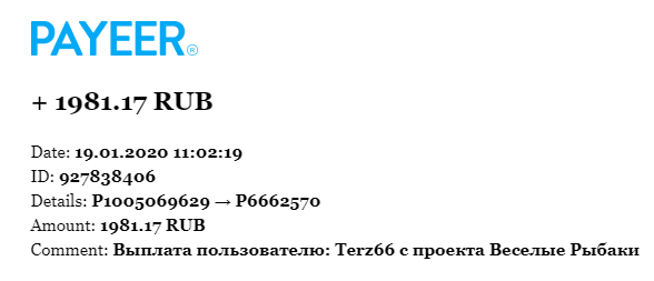 Comment: Выплата пользователю: timofeynch с проекта Веселые Рыбаки