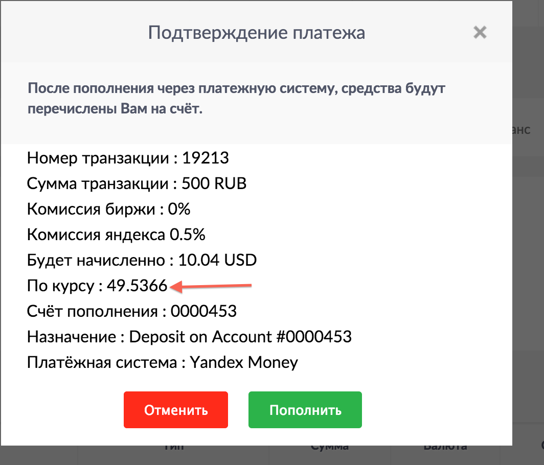 Здравствуйте! Валюта биржи - доллары. Как происходит конвертация при пополнении Яндекс деньгами? Нигде не нашел курса обмена. Допустим хочу пополнить кошелек на 120$, сколько мне надо внести рублей?