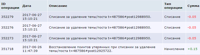 351718 2017-06-26 11:47:39 Восстановление поинтов утерянных при списании за удаление темы/поста t=487586#post12925722. Начисление +0.15