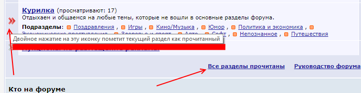На главной странице внизу, прямо перед модулем "Кто на форуме" есть кнопка "Все разделы прочитаны", или Вы что-то иное имеете ввиду?Подскажите, куда подевалась функция "отметить все как прочитанное"? Неужели нужно заходить во все 100 500 тем, чтобы они считались прочитанными?