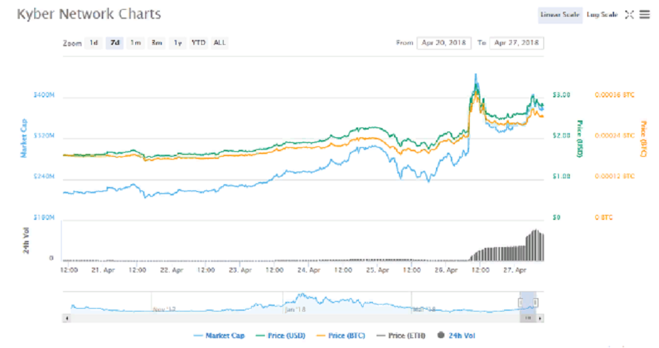 Цена на токены Kyber Network, децентрализованного решения, которое на данный момент работает на базе сети Ethereum недавно пережила потрясающий взлет после того как стало известно о включении этого токена на одну из крупнейших криптовалютных бирж Южной Кореи Bithumb.