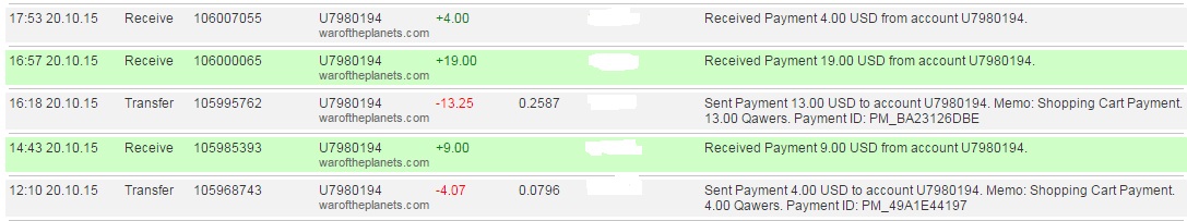 waroftheplanets.com -3.05 Sent Payment 3.00 USD to account U7980194. Memo: Shopping Cart Payment. 3.00 Palich984. Payment ID: PM_290D4D60FD