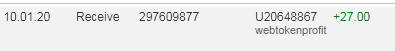 webtokenprofit +9.00 Received Payment 9.00 USD from account U20648867. Memo: API Payment. withdraw 9 to ProfitHuntersBIZ from Webtokenprofit. Payment ID: f25a05f0-3237-11ea-8a12-cf145eb7dfb9
