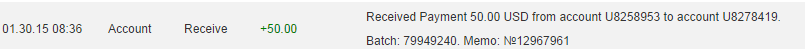 30.01.15 05:53 Receive Received Payment 50.00 USD from account U8258953 to account U3972ххх. Batch: 79942216. Memo: №12918021
